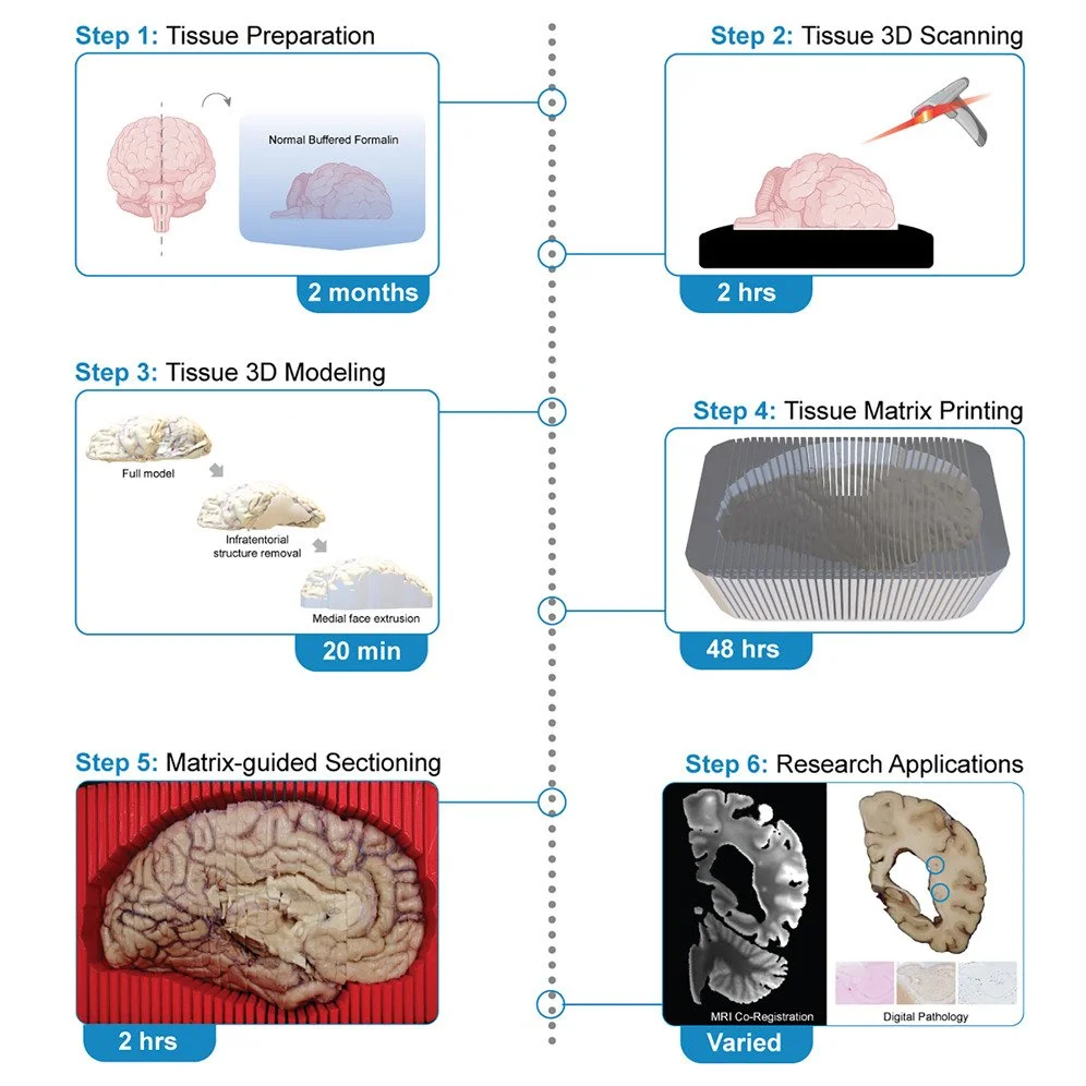 Three-dimensional (3D) structured-light scanning can render high-resolution models of different objects using pulsed light and cameras. In our laboratory, we constructed a 3D modeling studio where we 3D scan every brain that comes into our brain bank. Why do we do this? Neurodegenerative diseases have “selective vulnerability” - certain neuronal networks or systems degenerate, while other networks/systems are spared. In turn, this results in tissue atrophy or shrinkage of specific brain structures. Measuring patterns of atrophy is important, especially when you consider the size and folding patterns (gyrification) of each individual brain is unique to begin with! The incredible value of these 3D brain models is threefold: 1) they improve our ability to work with the brain tissue (via 3D printed tissue matrices), 2) they can be analyzed to assess tissue atrophy, and 3) they are educational resources and references (especially when incorporated into augmented reality and virtual reality environments)!
